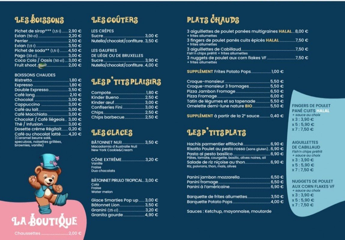 Pendant que les enfants s’amusent, les accompagnateurs peuvent se détendre dans l’espace snack et restauration du parc. Pensé pour les familles, cet espace propose des plats simples, équilibrés et adaptés aux goûts des enfants : burgers, nuggets, frites, mais aussi salades ou menus sucrés. L’ambiance y est détendue, et l’espace permet de se retrouver pour partager un repas après les jeux.