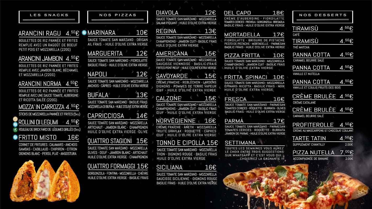 Le four à bois traditionnel, pièce maîtresse du restaurant italien, diffuse chaque jour ses parfums boisés et ses notes de pâte dorée. Les pizzas y sont préparées dans le plus pur respect de l’art napolitain : pâte fine et aérienne, fermentation lente, cuisson vive à haute température. Margherita, Calzone, Diavola, Quattro Stagioni, ou encore les créations maison de Renato, toutes les recettes mettent l’accent sur la simplicité des bons produits et la justesse des saveurs. Les pizzas sont disponibles à emporter, idéales pour prolonger l’expérience Da Renato à la maison, au bureau ou lors d’un déjeuner sur le pouce.