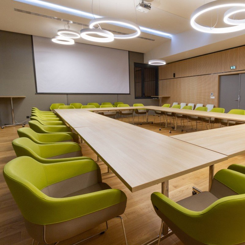 Salle de réunion et conférence : Conçue pour les réunions stratégiques et présentations clients. Mobilier de prestige, équipements audiovisuels intégrés et acoustique maîtrisée.
