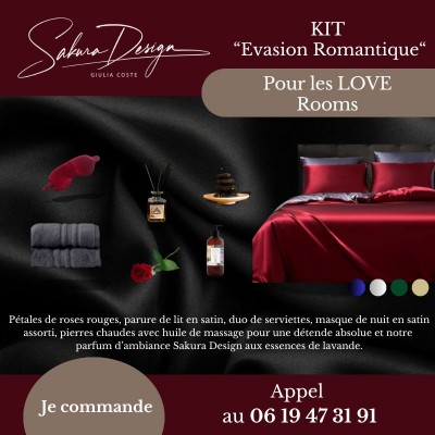 Pour les hôteliers, propriétaires Airbnb ou spécialistes de la love‑room, Sakura Design a élaboré des kits décoration clefs en main. Parmi eux, le kit “Évasion romantique” transforme un espace en love‑room luxueuse, tandis que les kits pour hôtels et locations améliorent l’attractivité visuelle et fonctionnelle des chambres. Ces solutions packagées facilitent la décoration sans stress, tout en garantissant un résultat professionnel et soigné.