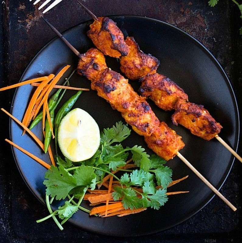 Les Chicken Tikka (blanc de poulet mariné aux épices indiennes et grillé au tandoor).