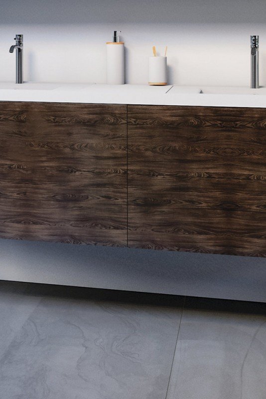Plans de Toilette : Large choix de surfaces hydrofuges : Quartz, Dekton, Granit ou stratifié décor bois.